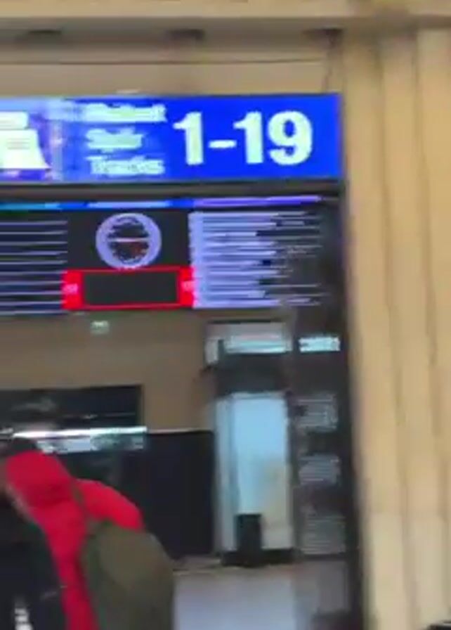 interior of a large transportation hub, likely a train station or airport. The camera appears to be moving along with people walking through the space. People are walking by in various clothing, including coats and backpacks. There are large display boards showing transportation schedules. A sign indicates the direction to luggage and restrooms. The floor is tiled.
