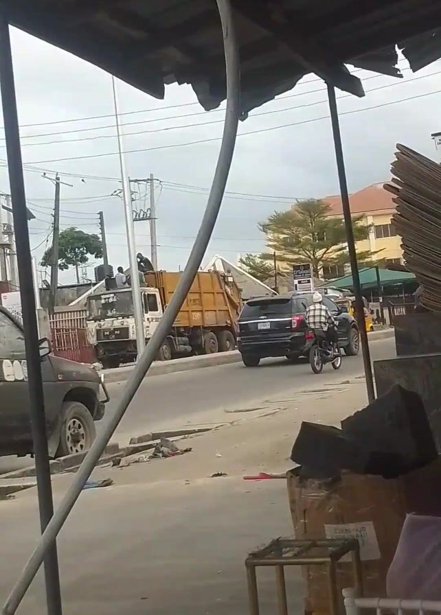 The video depicts a street scene captured from under the shelter of a building or structure. A street runs horizontally across the frame with various vehicles traveling on it. A dark pickup truck is parked on the near side of the street. Further down the street, a yellow garbage truck is visible, with two people sitting on top of it. Cars, including a white Mercedes SUV and a dark SUV, are also moving on the street. A motorcycle with a rider is also seen. A building with a yellow exterior and red roof is visible in the background to the right. Utility poles with electrical wires run along the side of the street. Various objects and materials, including stacks of wood and other unidentified items, are visible in the foreground. The sky is overcast, suggesting a cloudy day. The overall impression is of a typical urban street scene.