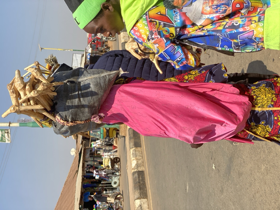The image depicts a bustling street scene in Kafanchan B, Nigeria, under a clear, bright sky. In the foreground, two individuals are visible. On the left, an adult, viewed from the back, balances a large, dark grey woven sack on their head, topped with numerous light-colored, carved wooden objects resembling small staffs or crutches. This person wears a long, bright pink garment over a brightly patterned fabric dress featuring blue, yellow, red, and black motifs. A colorful patterned fabric strap is visible securing the head-load. To the right, a younger individual, viewed in profile, wears a black and bright green beanie and a multi-colored hooded jacket. The jacket is branded with "TikTok" logos and displays a graphic of a person, possibly labeled "SANDAKA." This individual holds several of the same carved wooden objects in their arms and directs their gaze to the left, towards the person carrying the head-load. The background reveals an active urban environment. On the left side of a paved road, a series of market stalls with corrugated metal roofs display various goods. Pedestrians move within the scene, including one person pushing a wheelbarrow. A yellow motorized tricycle is present on the road. Overhead wires, a green street light pole, and other urban infrastructure elements are visible under the sun.