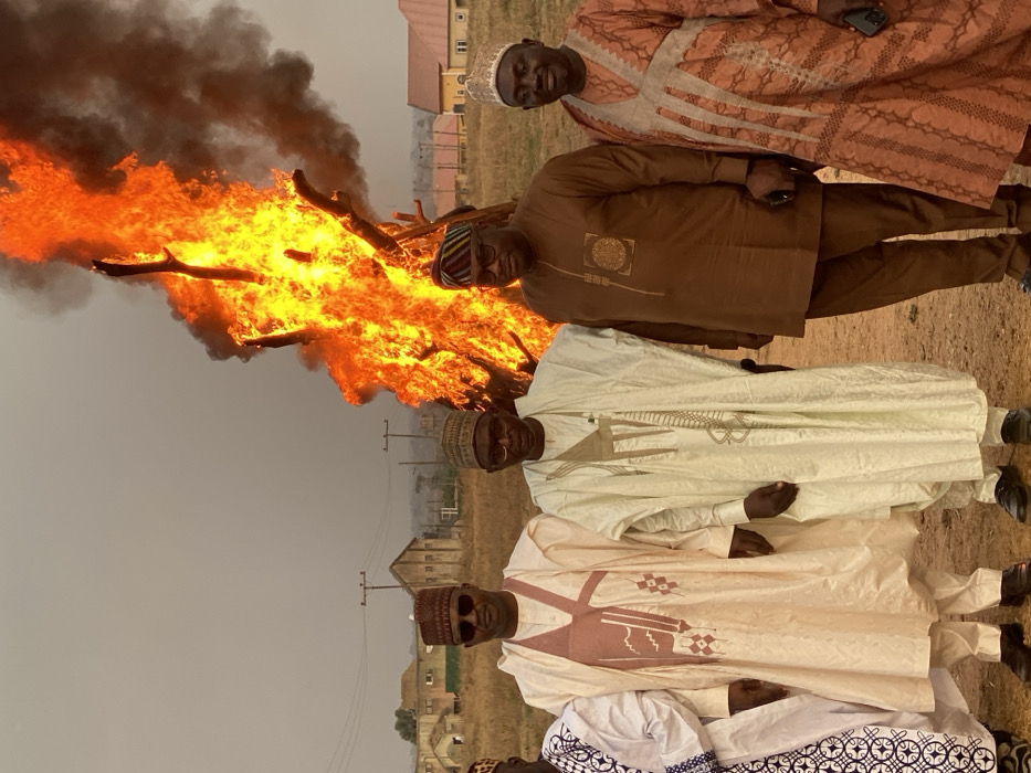 Four men wearing traditional attire stand in front of a large fire. The fire burns intensely, creating thick black smoke that rises into the sky. The men are wearing different shades of brown and white, and all appear to be looking towards the camera. The background consists of a dry, grassy field, a few buildings, and power lines under a hazy sky.