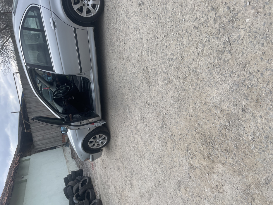 The image depicts an outdoor scene in Razgrad, Bulgaria, under an overcast sky. A silver four-door BMW E39 sedan is centrally positioned, parked on an unpaved surface consisting of gravel and compacted dirt. The vehicle's front left (driver's side) door is open. To the left of the sedan, a substantial pile of black automobile tires is stacked against a light-colored, possibly stucco or painted, wall. Above this wall, a portion of a red-tiled roof is visible. In the background, extending behind the car, is a weathered fence or barrier, possibly constructed from wood or concrete. Bare tree branches are silhouetted against the cloudy sky above the fence line. No human subjects are present in the scene.