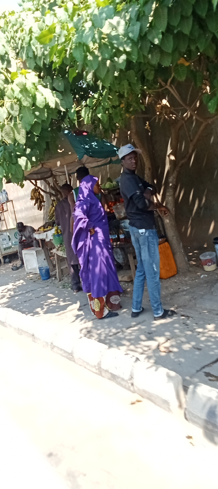 The scene depicts a street-side market stall operating under the partial shade of a large, leafy tree in Kaduna, Nigeria