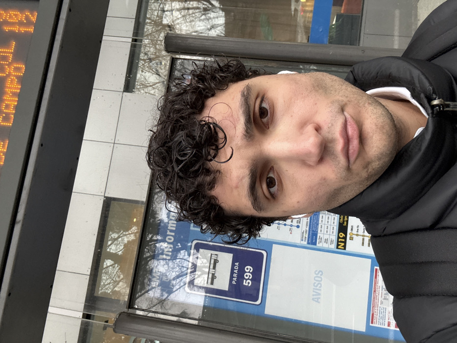 A male individual, appearing to be in his 20s or early 30s, with dark, wet-look curly hair and light facial stubble, poses for a headshot-style image. He has brown eyes and a neutral, slightly pensive expression with his lips slightly pursed. A small reddish mark is visible on his forehead. He wears a black puffer jacket over a white collared shirt and has a white wireless earbud in his right ear. A black backpack strap is visible over his left shoulder. The individual is positioned in front of a bus stop shelter, which features glass panels reflecting an outdoor urban environment with bare trees. Behind him, on the left, a blue-and-white sign displays a bus icon and the text "PARADA 599", with "AVISOS" below it. To the right of this sign, a bus route map is visible, partially showing "N19", indicating a night bus route. Above the shelter, a dark digital display with orange LED text shows partial information including "...DE CAMPO UL 12...". The background architecture includes a building with gray square paneling. This scene is located at an EMT Madrid bus stop, specifically "Parada 599" at Avenida de la Democracia, 15, in Madrid, Spain.