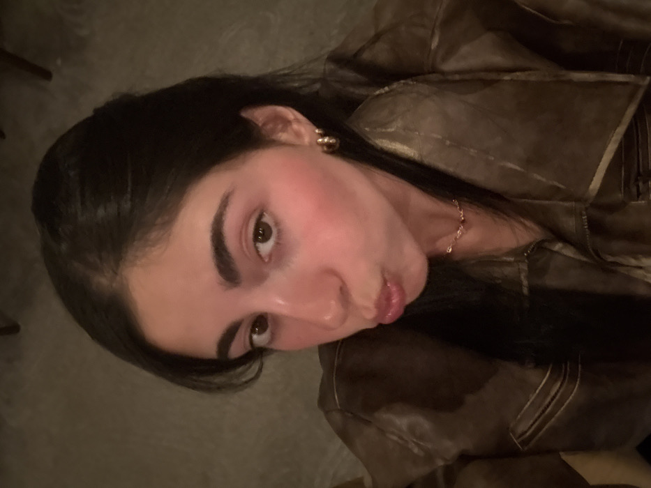 A female subject is depicted in a close-up, chest-up shot. She has dark hair, dark brown eyes, and prominent eyebrows. Her skin appears fair with a pinkish blush on her cheeks. Her lips are pursed in a "kissing" expression, and she looks directly at the camera. She is wearing a dark brown or olive-green jacket, possibly leather or faux leather, featuring a wide collar and horizontal seam details on the chest. Accessories include small gold-colored hoop earrings in her visible right ear and a delicate gold-colored chain necklace. The background is uniformly dark and out of focus, offering no discernible features or objects. Lighting is dim and warm, consistent with an indoor evening setting. The image provides no visual information to identify the location as Rum Cay, Bahamas, or any specific city.