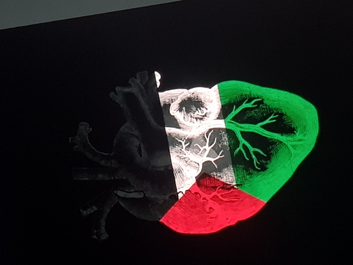 The scene is a close-up photograph of a digital display, taken in the city of Patong, Thailand. The display exhibits a stylized anatomical illustration of a human heart set against a solid black background. The upper portion of the heart, including its major vessels, is rendered in a dark, near-black tone. The main cardiac mass is horizontally segmented into three distinct color bands: the left third is red, the central third is white, and the right third is green. Intricate fine white lines, depicting internal vascular and anatomical structures, are visible within the white and green sections. The overall presentation of the colored segments, combined with the black upper portion, evokes a national flag design. No individuals, additional subjects, or explicit actions are present in the visible frame. Minor screen artifacts, consistent with a digital display, are discernible, along with a subtle light reflection in the upper right corner of the display surface.