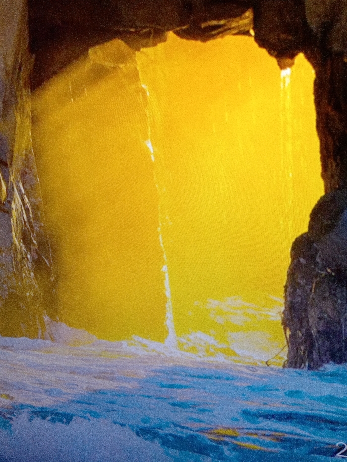The image displays a natural rock formation or cave entrance situated in the city of Olambe, Nigeria. A large volume of intense, bright yellow light emanates from an external opening, illuminating the central area. Dark, rugged rock walls form an archway at the top and frame the scene on the left and right. Visible shafts of light penetrate through what appears to be mist or spray within the opening. At the base of the rock formation, a body of blue water with significant white foam and crests indicates active wave or current movement. Water droplets or a thin stream are observed descending along the left rock face. No individuals or man-made objects are present within the frame.