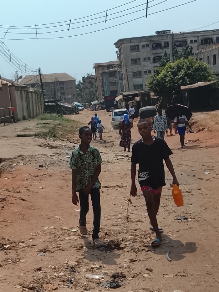 The image depicts a daytime scene on a dusty, unpaved urban street in Onitsha, Nigeria