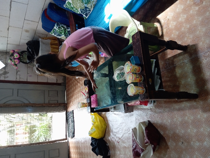 A young girl in a pink tank top leans over a dark wood table. Several containers sit on the table's surface, some seemingly filled with green items. A window is visible in the background, partially obscured by a black mat. A yellow plastic bag sits near a black jacket. The room is filled with various items, including a blue object in the upper left and a chair near the table. The floor has a patterned design.