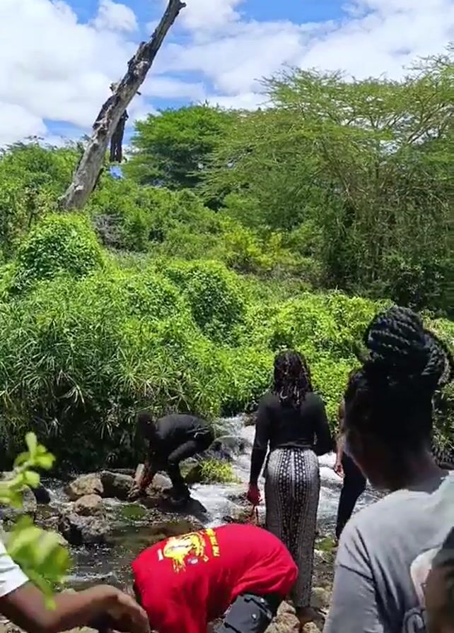**Scene:** The video is shot outdoors on a sunny day with a bright blue sky dotted with scattered white clouds. The environment is lush with greenery, featuring dense vegetation and tall trees. A small, rocky stream flows through the scene. **People:** A group of individuals is present. They are diverse in appearance. Several are seen standing near or in the stream. **Actions:** Some individuals appear to be entering the stream, while others are already in or near the water. People are observed looking and stepping carefully onto the rocky surface of the stream. There's also an ongoing conversation, with voices audible in the background. **Objects:** Prominent objects in the scene include the stream itself, rocks of varying sizes within the stream, lush green vegetation, tall trees, and a large, dead tree trunk lying near the stream. **Interactions:** Individuals are interacting with each other verbally, as evidenced by the conversation. They are also physically interacting with the environment by navigating the stream and its rocky terrain. **Additional details:** The video appears to be shot handheld, with slight camera movement.
