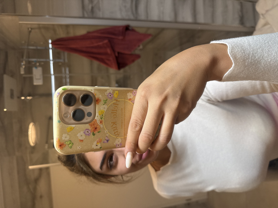 A person with long brown hair is taking a mirror selfie. They are wearing a white long-sleeved shirt. The phone has a yellow Hello Kitty case with floral patterns. The bathroom background includes a glass-enclosed shower with a red towel draped inside. The mirror reflects the scene, including the person and their phone.