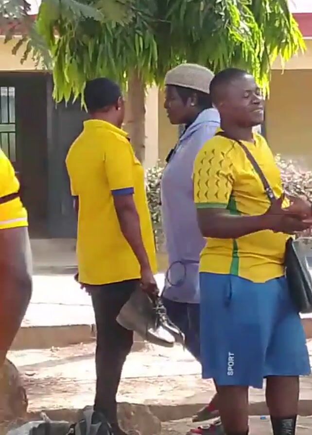 The video depicts a group of men in a casual setting. Some are wearing sports attire, including yellow and blue shorts and jerseys. A man in a yellow jersey with the inscription "MFM Football Evangels" shakes hands with another man wearing a red long-sleeved shirt with the number 14 on the back. Some men sit on the ground while others stand, possibly before or after a sporting activity. The environment appears to be outdoors, possibly a sports field or training ground, with trees and a building in the background.