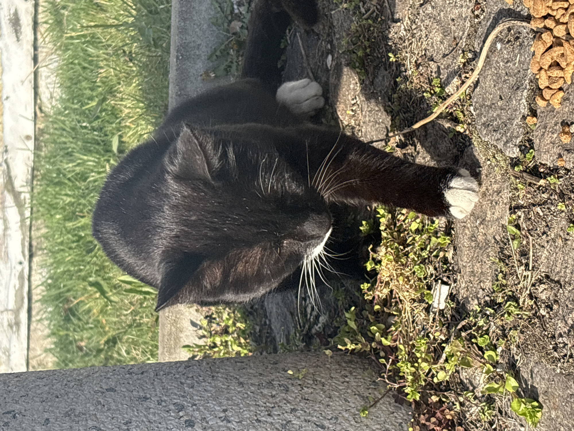 An outdoor scene in Burgas, Bulgaria, displays a domestic cat in a low, crouched posture. The cat is predominantly black, featuring a distinct white right front paw and prominent white whiskers. Its head is oriented downwards, towards a quantity of light brown dry kibble scattered on the grey paved ground in the lower right foreground. A textured, grey stone pillar occupies the left side of the frame. The ground consists of irregular grey paving, interspersed with sparse green vegetation and exposed soil. A patch of green grass and a light-colored, weathered barrier are visible in the background. The scene is illuminated by direct sunlight, casting discernible shadows.
