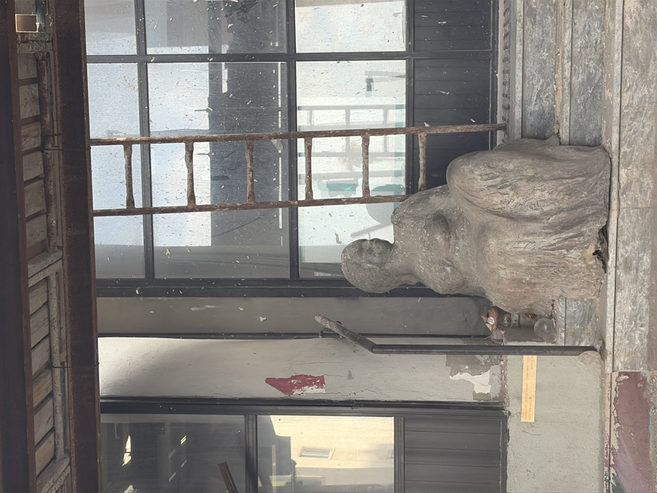 The image depicts the exterior of a building located in Tel Aviv, Israel, characterized by a worn and somewhat unkempt appearance. Central to the scene is a large, grey-brown sculpture of a seated female figure, appearing to be constructed from a coarse material such as concrete or stone, positioned on the lower steps directly in front of the building's facade. The sculpture, with visible breasts and a draped lower body, faces towards the right of the frame. To the left of the sculpture, a black metal handrail with a worn, grey concrete base extends upwards. A few small, indistinct objects, including a small, reddish-brown figurine and a clear, spherical object, are placed on the steps beside the sculpture. A light brown rectangular plaque with text is affixed to the painted wall to the left of the handrail. This wall exhibits significant peeling of its white or light grey paint, revealing a darker underlying surface, and features a distinct, irregular red mark on its upper section. The background consists primarily of a large window wall composed of multiple panes framed in black. These windows appear dirty or dusty and reflect elements of the surroundings, including indistinct building shapes and sky. A heavily rusted metal ladder, featuring five visible rungs, leans against the right side of the window frames. Above the windows and ladder, a rusted horizontal beam supports an overhead structure composed of multiple narrow, horizontal wooden slats. The scene is illuminated by natural daylight, and no living individuals are present.