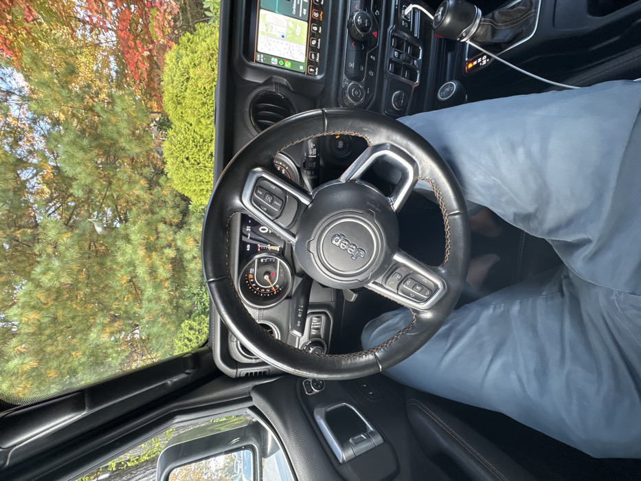 The image displays a first-person perspective from the driver's seat of a Jeep vehicle, stationary in Wellesley, United States. A person's legs, clad in light blue athletic pants, are visible beneath the black leather steering wheel, which features brown stitching and a central "Jeep" emblem. The dashboard ahead includes a digital instrument cluster and a central infotainment screen displaying a map interface. To the right, a gear shifter is visible, with a white charging cable connected. Through the windshield, a bright outdoor scene shows mature trees with green, yellow, and red autumn foliage, along with dense green bushes, indicating a clear, sunny daytime environment during the fall season.