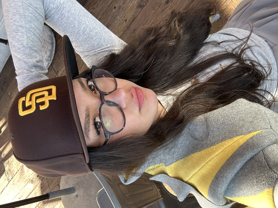 A medium close-up, high-angle portrait features a female individual with long, dark, wavy hair. She wears a brown baseball cap with a yellow "SD" logo (San Diego Padres) and tortoiseshell eyeglasses. Her eyes are directed towards the viewer, and her lips have a light pink tint. She is dressed in a light grey long-sleeved top, under a grey and yellow striped outer garment draped over her left shoulder. A silver-colored necklace with a cross pendant is visible against her top. Her right arm is bent with the hand positioned behind her head. The background consists of weathered, light brown wooden planks, consistent with a pier or boardwalk, and a dark vertical pole is partially visible on the left. The scene is illuminated by natural sunlight, indicating an outdoor setting in Malibu, United States, likely the Malibu Pier.
