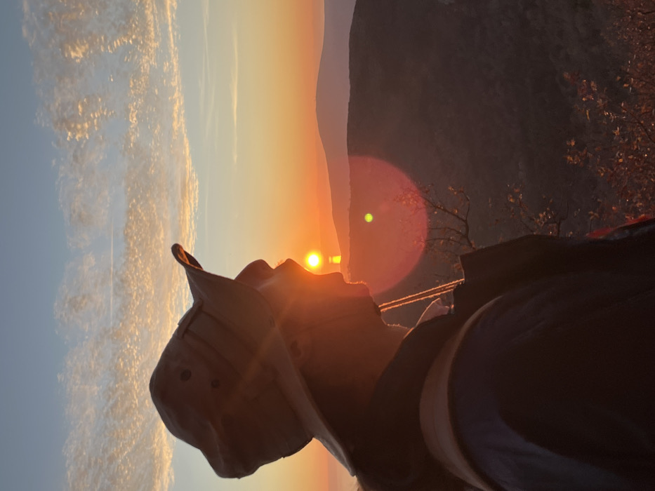 A silhouetted figure wearing a hat stands against a vibrant sunset. The sun aligns near the figure's face, creating a bright spot. To the right, a dark mountain or hill dominates the scene. Clouds streak across the sky, tinged with the colors of the setting sun. A lens flare adds a red and green glow to the right side of the image, partially obscuring some tree branches. The photo is rotated ninety degrees counterclockwise.