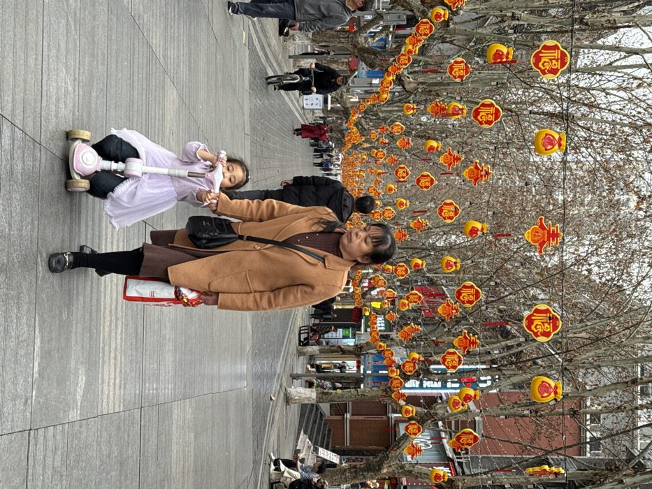 The image captures a pedestrian street in Beibei, China, decorated with festive Chinese New Year ornaments
