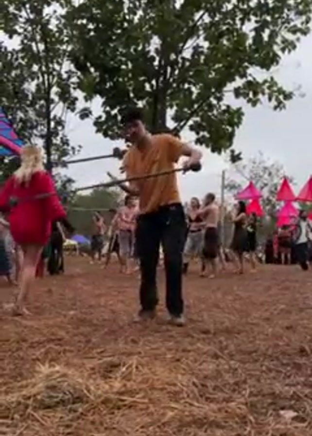 A man in a yellow shirt and dark pants holds a long stick and performs a dance or rhythmic exercise, twirling and moving the stick around his body. He is surrounded by a group of people dancing or moving rhythmically on a ground covered in straw or dry grass. The scene appears to be at an outdoor gathering or festival, with colorful flags or decorations visible in the background. The area is somewhat open, with scattered trees and a cloudy sky.