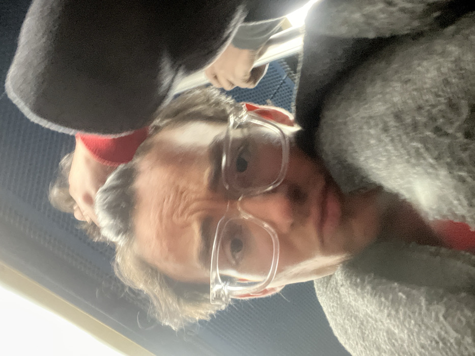 A person with light skin and wearing clear-framed glasses looks directly at the camera from an upward angle. They have short, dark hair and a wrinkled forehead, suggesting a slight frown. A gray, fluffy sweater covers the right side of the frame, while a dark-colored garment obscures the top left corner. A hint of red clothing appears near the collar. The background is out of focus, showing a blue textured surface.