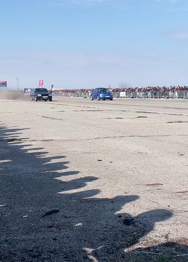 two cars drag racing on an asphalt course, with a crowd of people lining the side of the track. The cars, a dark colored Volkswagen Golf and a blue Volkswagen Beetle, accelerate quickly side-by-side. The Beetle edges ahead, and the cars race down the course, kicking up dust. The camera then tracks the Beetle as it continues down the race course on its own. The sky is bright blue with some clouds. Some tree shadows stretch onto the pavement.