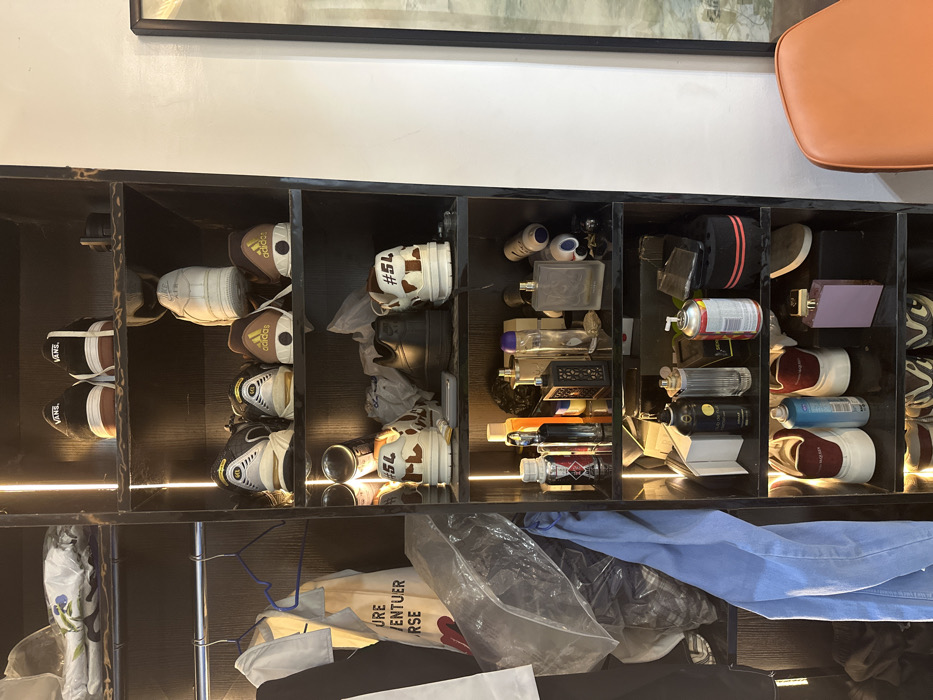 The image depicts the interior of a room, likely a dressing area or bedroom, located in Orie Uratta, Nigeria. The primary subject is a dark-colored, multi-tiered shelving unit or wardrobe positioned against a plain white wall. The shelving unit is illuminated by internal vertical LED strip lighting along the right edge of each shelf. On the top shelf, two pairs of sneakers are arranged: a pair of black Vans sneakers with white soles and a pair of white Nike Air Force 1 sneakers. The second shelf displays four pairs of athletic shoes, including two pairs of Adidas sneakers with brown uppers and yellow logos, and two pairs of grey-and-white athletic shoes. The third shelf contains various items, including a pair of black sneakers, a pair of brown-and-white patterned sneakers marked "#54L" on the heel, and several small containers. The fourth shelf holds an assortment of glass bottles, indicative of perfumes or personal care products, alongside a black decorative lantern and other small objects. The fifth shelf features additional bottles, including a pump-top dispenser, a spray can with red and yellow accents, and a black circular cleaning brush with an orange stripe. The bottom visible shelf displays two pairs of white-soled sneakers, one with maroon and the other with blue accents, next to a rectangular purple bottle and a brown object. To the immediate left of the shelving unit, a clothing rack is partially visible, from which a white short-sleeved shirt and a cream-colored tote bag with "VENTURERSE" text and a red graphic are hanging. A transparent plastic bag containing bundled items rests below these garments, next to a light blue garment, possibly jeans, draped over other items. The background on the right side of the image consists of a flat white wall. A portion of a framed artwork or mirror with a dark border is visible against this wall. In the lower right corner, the orange padded back and seat of a contemporary chair are present. No individuals are visible in the scene.