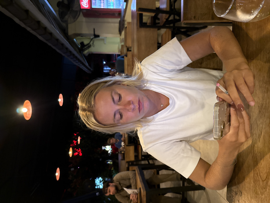 The image displays an evening scene at an open-air or semi-open-air dining establishment located in Thissamaharama, Sri Lanka. A light-skinned female with blonde hair, wearing a white t-shirt and a delicate necklace, is seated at a wooden table in the foreground. She is focused on a smartphone, holding it in both hands, while simultaneously holding a lit cigarette between the index and middle fingers of her right hand. Her fingernails are painted a brownish-pink. A clear glass containing liquid is partially visible on the table to her right. In the background, a male figure with dark hair and a beard, dressed in a brown jacket, is seated at another wooden table to the left. Further back, another male figure is indistinctly visible. The dining area is furnished with multiple wooden tables and chairs. The overhead space features several orange-toned pendant lights suspended from a dark ceiling, providing ambient illumination. Beyond the immediate dining area, green foliage interspersed with decorative red and blue lights suggests an outdoor or garden setting. To the right, a section of a building with a tiled roof is visible, along with a white ceiling fan and a red Coca-Cola branded refrigerator stocked with beverages.