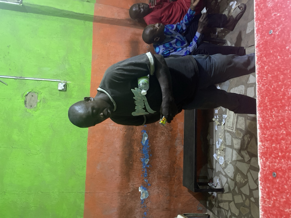 Three men occupy a room with a green and orange wall. One man stands, wearing a dark shirt, pants, and holding a drink. He has a water bottle tucked into his shirt. The other two men are seated behind him, one in red and one in a blue patterned shirt. Debris litters the floor, which has a mosaic pattern. A metal bench sits near the standing man. The room is brightly lit.