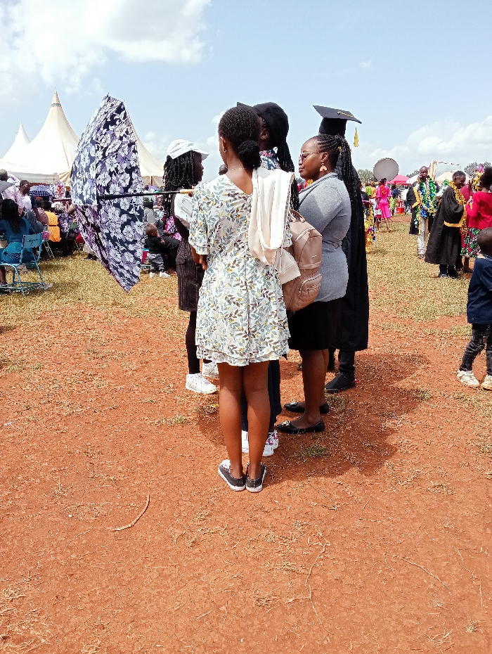 A group of people stand on a reddish-brown field, possibly at an outdoor graduation ceremony. Tents are visible in the background. The people are dressed in a variety of clothes, including a graduation gown, dresses, and casual wear. One person holds a large, open umbrella with a floral print. There's a mix of dark and light skin tones among the people. The overall atmosphere appears to be celebratory.
