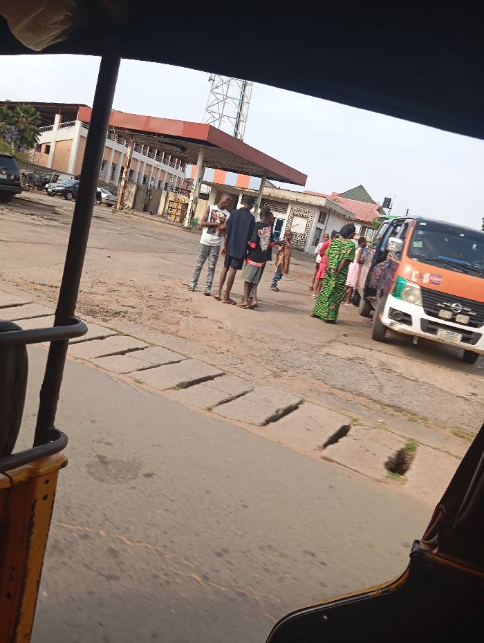 A group of people stand near a fuel station and a white and orange van. Some are wearing casual clothes, while others are dressed in patterned garments. The scene is viewed from inside a yellow vehicle with metal bars. The road is asphalt and cracked, and concrete drainage channels run along the side. A communications tower rises in the background. Cars are parked nearby.