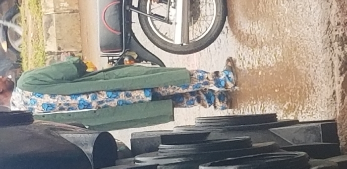 The image depicts an outdoor scene in the city of Unknown, Unknown, characterized by a wet and muddy ground. A single adult individual is observed from behind, facing right. This individual wears an olive green, long-sleeved tunic featuring a prominent vertical panel of blue and beige floral patterned fabric on the back, secured with white buttons. Matching floral patterned trousers and open-toed sandals complete the attire. The individual holds a white, cylindrical object, likely a cigarette, in their right hand, appearing to be smoking. In the left foreground, a large, dark, multi-ringed object, possibly part of a heavy vehicle or stacked tires, partially obscures the scene. To the right of the individual, a black motorcycle is visible, showing its rear wheel, fender, and a portion of the seat with a red semi-circular design. The ground is covered with numerous brown puddles of water. A concrete curb and sparse green vegetation are visible in the background, along with indistinct structures and a partially visible vehicle.