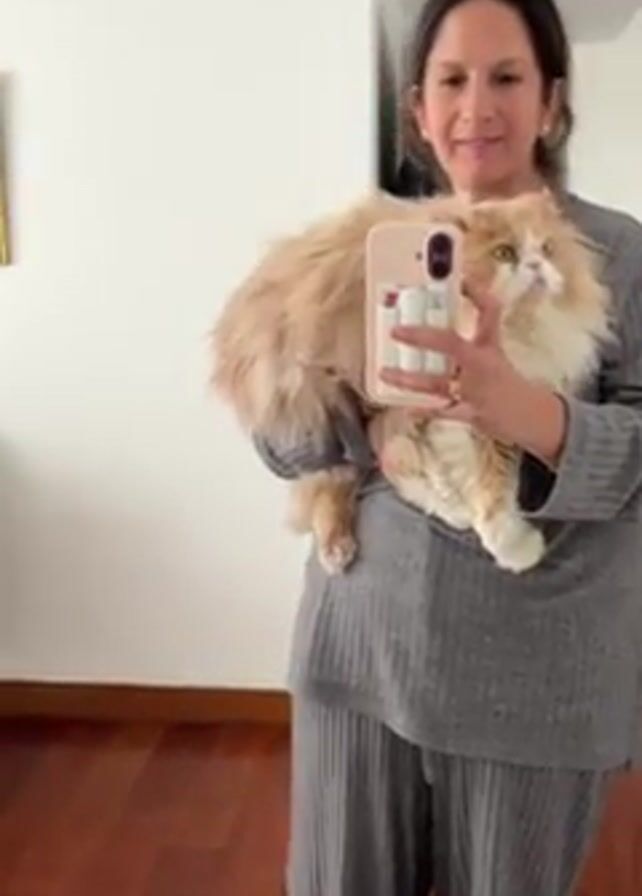 A woman wearing gray pajamas is holding a fluffy cat in front of a mirror while looking at the camera on her smartphone. The cat is tan, white, and brown. The woman is smiling and speaking in Spanish. The floor is wooden. The wall behind the woman is white. There is a tall mirror in the background. The woman's phone has a light pink case with a white holder.