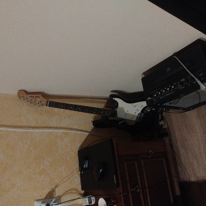 The image displays an interior room corner. A black electric guitar, featuring a white pickguard, chrome hardware, and a light-colored maple neck with a dark fretboard, stands leaning against the intersection of two walls. The left wall exhibits a textured, yellowish-brown finish, while the right wall is plain and light beige. Branding is visible on the guitar's headstock. On the floor to the right of the guitar, a black guitar amplifier rests, showing a control panel on its upper surface and a purple guitar pick positioned on top. A white cable connects to the amplifier. To the left, a dark brown wooden two-drawer cabinet supports a closed black laptop with a black computer mouse placed upon it. A white and orange disposable cup is situated on the cabinet surface near the laptop. An exposed white electrical outlet on the textured wall, in the upper-left quadrant, has several white and black cables plugged in, one of which leads to a small white electronic device. The floor is covered with wood-patterned flooring. No individuals are present. The image does not contain sufficient visual information to ascertain the specific location within the city of Levski, Bulgaria.