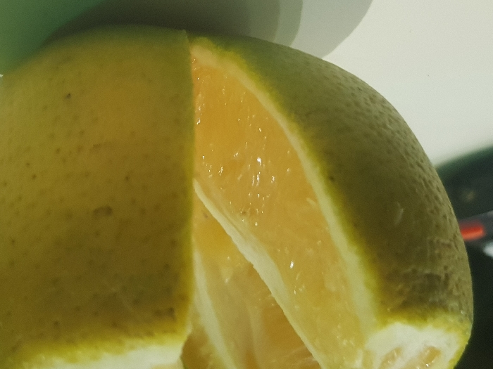 - "A large, spherical citrus fruit, consistent with a pomelo or large orange, is centrally positioned on a white, flat surface in an indoor setting within the city of Unknown, Unknown" by FM-OjXMO2, licensed under CC BY 4.0
