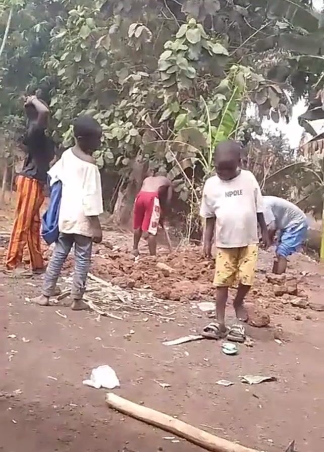Several individuals are working in an outdoor setting with trees and banana plants in the background. There are children and adults in the scene. Some individuals are digging in the dirt, using tools, while others observe. A pickaxe lies on the ground in the foreground. The ground appears to be dry and dusty.