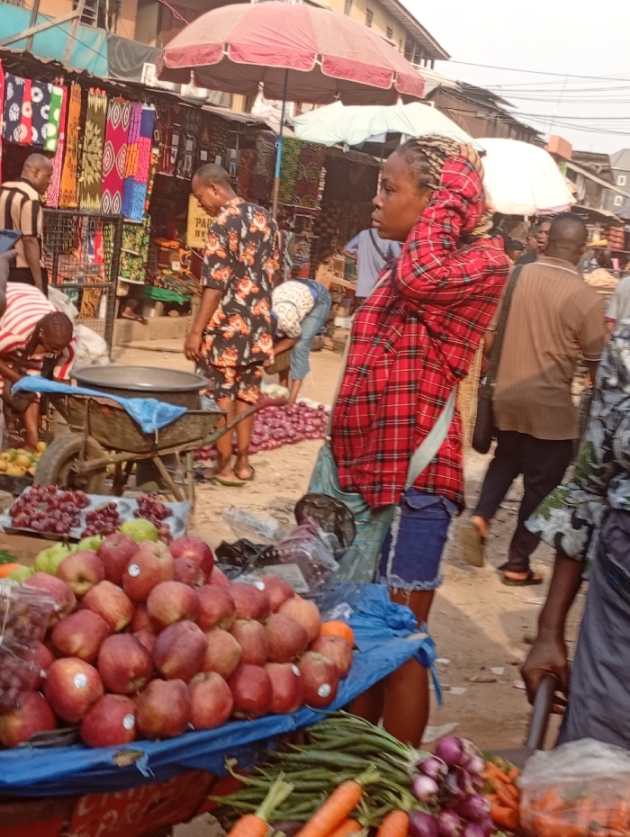 This image depicts a bustling outdoor market scene in Fegge, Nigeria. In the foreground, a female with braided hair, wearing a red plaid long-sleeve shirt and blue distressed denim shorts, stands with her left hand behind her head, looking towards the left. She has a blue shoulder bag. Directly in front of her is a market stall displaying a large pyramid of red apples on a blue tarp, alongside green grapes, green pears, carrots, green beans, and red onions. To the left, another person in a red and white striped shirt bends near a grey market cart with a single wheel and a large metal basin. Further left, a man in a black shirt with orange floral patterns and matching shorts leans over, looking downwards at red onions spread on the ground. Behind him, a man in a black and beige striped shirt stands near a stall displaying colorful patterned fabrics. The background features additional market stalls with various goods, including more textiles. Several other individuals are visible throughout the crowded scene, engaged in market activities. Overhead, red and white market umbrellas provide shade, and power lines are visible against the sky. Buildings of varying heights are present in the far background. The ground is an unpaved, light-colored surface, indicative of a busy outdoor market.