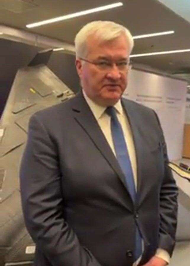 A medium shot shows a man in a dark blue suit with a light blue tie. He is wearing glasses and has short, gray hair. He is standing and speaking. In the background, there is what appears to be a dark gray model of an aircraft or spacecraft. There's a white sign behind the model with some text. The setting appears to be an indoor exhibit space, with fluorescent lighting overhead.