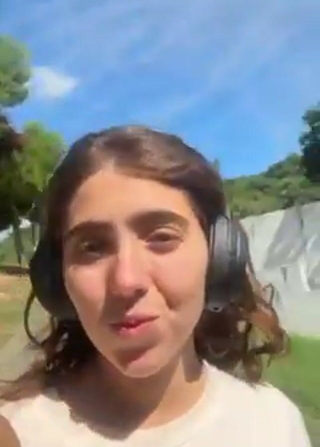 A young woman with curly brown hair wearing a white t-shirt and black headphones is walking and talking, likely filming herself. The background shows trees and a white structure with steps. The sky is blue and clear.