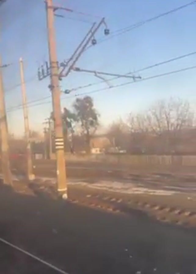 A shaky handheld video taken from the interior of a moving train shows the exterior landscape through a window. Power lines and telephone poles are visible, passing by in rapid succession. The landscape consists of bare trees and some buildings under a clear sky. The foreground includes the train’s window frame and reflections. A rhythmic banging sound is audible.
