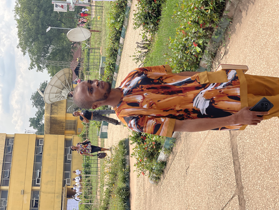 A young adult male, light-skinned with a shaved head and light beard, stands in the foreground, facing right (viewer's left). He wears an orange, black, and white abstract-patterned short-sleeved tunic over mustard-yellow trousers. His left hand holds a black smartphone; a book is tucked under his right arm. He stands on a textured, light-colored paved pathway. The scene is an outdoor campus or institutional setting in Uturu, Nigeria. In the midground, green lawns with manicured shrubs and red flowering plants are bordered by concrete curbs. A metal fence separates the foreground from the background elements. In the background, a multi-story yellow building with numerous windows and air conditioning units is visible. To the right of this building, a large white satellite dish stands prominently on a metal frame, with a second, smaller dish further right. A "ZENITH ATM" sign is discernible near the right edge, indicating a Zenith Bank Automated Teller Machine. Several individuals are present: a woman in a colorful blouse and dark skirt walks from left to right, carrying a dark handbag; another woman in a dark crop top and patterned trousers walks from right to left, holding a white cup. Further back, near the yellow building, a group of individuals, some in white shirts, are congregated. Trees and dense foliage are visible under a partly cloudy sky.