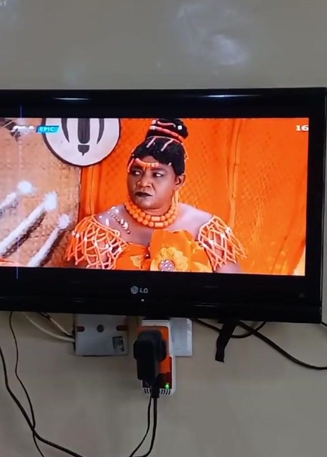 black LG television mounted on a light beige wall. The screen displays what appears to be a scene from a movie or show featuring two people dressed in what could be traditional African attire. Initially, a person with elaborate orange clothing and headwear is visible. The scene then transitions to a man with dark skin, wearing a simple brown cloth and beaded necklace. The television is connected to an electrical outlet via multiple plugs and adapters. A few black cords are hanging below the television, and some electrical components are visible. The general setting appears to be indoors.