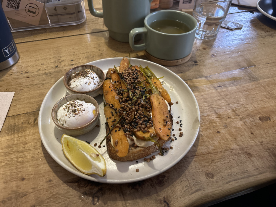 - "An overhead view captures a breakfast or brunch meal served on a rustic light-colored wooden table at Loop Coffee in Madrid, Spain" by FM-2rkLO2, licensed under CC BY 4.0