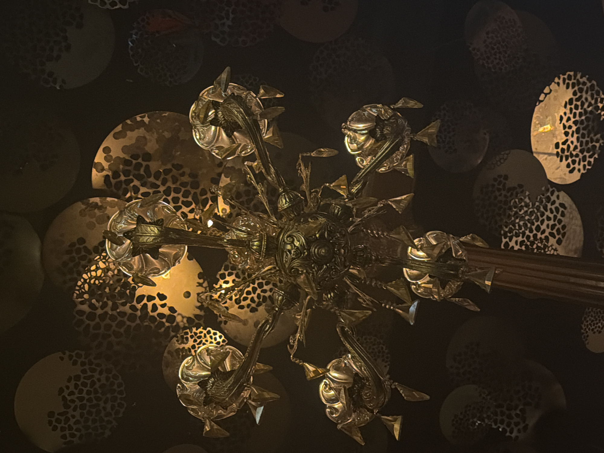 decorative ceiling in Madrid, Spain. The ceiling is adorned with multiple circular or disc-shaped metallic elements. These discs feature a patterned design, possibly perforations creating a mottled effect. In the foreground, a detailed and ornate metallic chandelier is prominently featured. The chandelier has multiple arms extending outwards and is likely made of brass or a similar alloy. The lighting fixture is positioned directly below the camera, offering an upward view toward the ceiling. The scene is dimly lit, creating stark contrasts between the brighter metallic elements and the darker background.