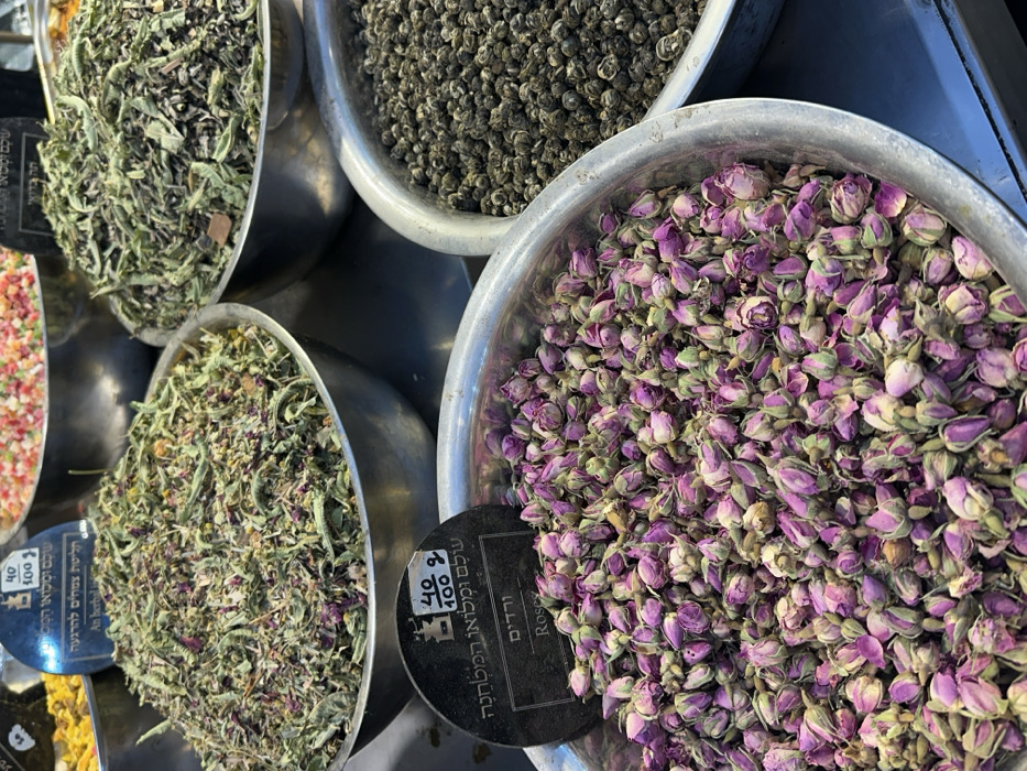 - "This image captures a close-up, eye-level view of an array of dried herbs, teas, and edibles presented in metallic bowls at a market stall in Jerusalem, Israel" by FM-jqiIm2, licensed under CC BY 4.0