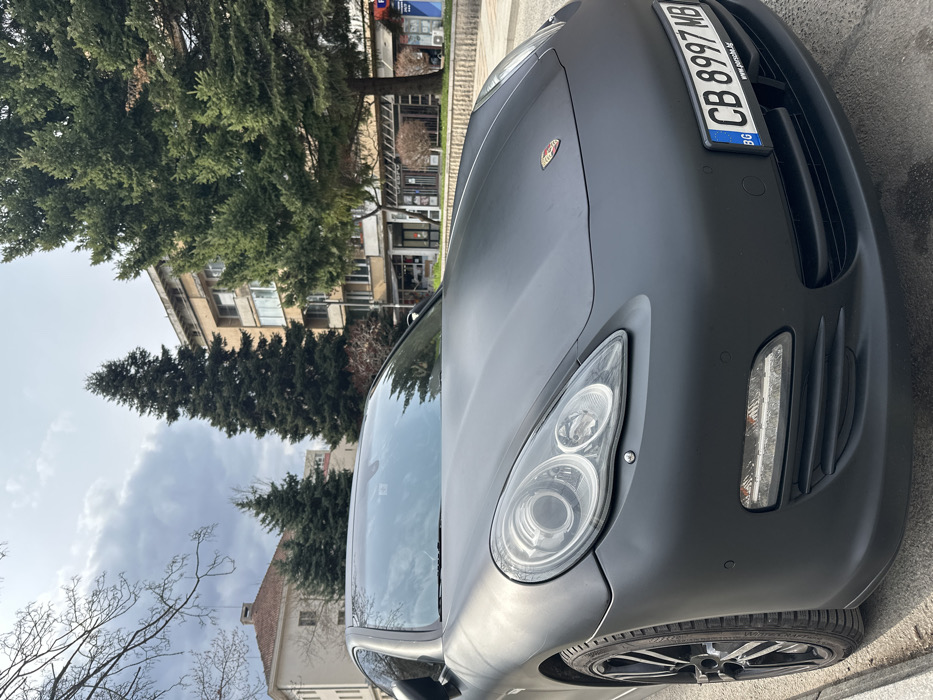 The image displays the front-left portion of a matte dark grey Porsche Panamera sedan, parked outdoors in Botevgrad, Bulgaria