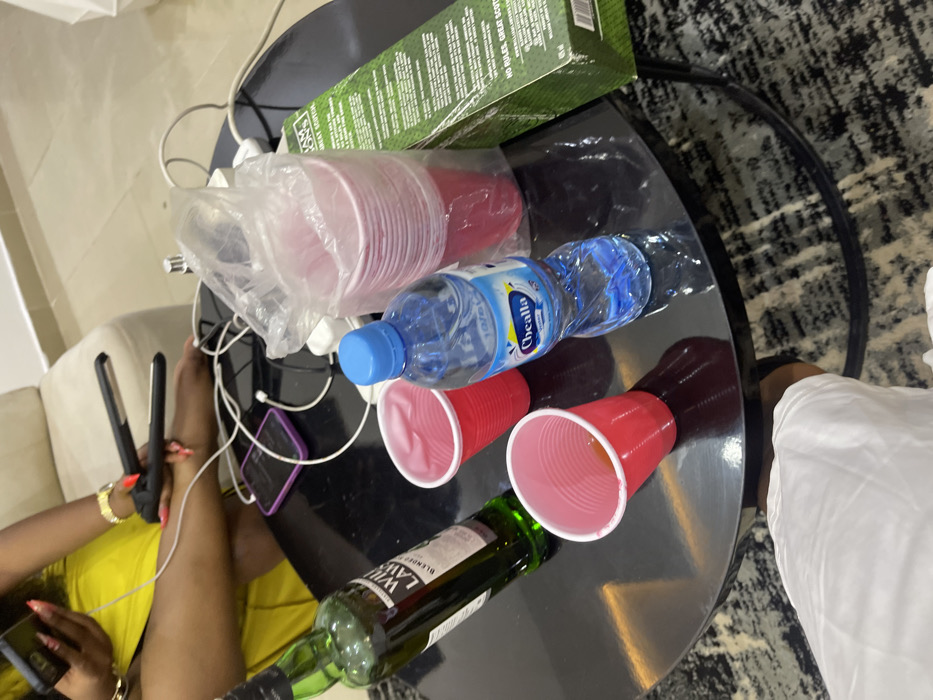 This image captures an indoor residential scene in Gwarinpa, Nigeria, centered on a dark, circular coffee table. The table holds a green glass bottle of "WILD LAW Blended Scotch," a blue-capped plastic bottle of "Chealla Water," two red plastic cups (one containing an amber liquid, the other empty), and a clear plastic bag filled with unused red plastic cups. A green cardboard box, likely for "WILLIAM LAWSON'S GREAT SCOTCH," is also on the table. Two smartphones, one black and one purple, are visible, connected to white charging cables that lead to a white power adapter. A female individual is partially visible on the left, seated on a light-colored sofa in the background. She wears a yellow garment and a gold watch on her left wrist. Her red-manicured hands hold a black smartphone with a gold case and a black hair straightener. Her bare feet are visible near the table's edge. In the bottom right foreground, the lower leg and foot of a second individual, clad in white attire, are visible. The floor beneath the table is covered by a black, white, and gray patterned rug. The overall arrangement suggests a casual social gathering or personal preparation within a domestic setting.