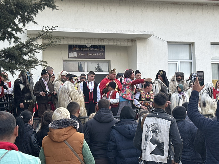 The image captures an outdoor cultural event in Novo Panicharevo, Bulgaria, specifically in front of the "НАРОДНО ЧИТАЛИЩЕ Отец Паисий 1927" (National Cultural Center Father Paisiy 1927) building. In the midground, approximately twenty individuals are gathered on a low platform or stage. This group consists of performers and participants dressed in various traditional Bulgarian costumes, including several individuals in shaggy white and dark fur Kukeri masks and full-body outfits. A man wearing a red cloak and a golden crown stands centrally, alongside a woman in a colorful floral jacket who is actively gesturing with her right arm. Nearby are a child in a traditional white shirt and red vest, and a man in a dark robe with a cross on his headwear, resembling an Orthodox priest. The foreground is occupied by a crowd of spectators, largely viewed from behind, observing the event. One person on the far right holds a smartphone vertically, recording the scene. The background features the light-colored, two-story community building with two large windows, partially obscured by a tree branch on the left. The sky is overcast.