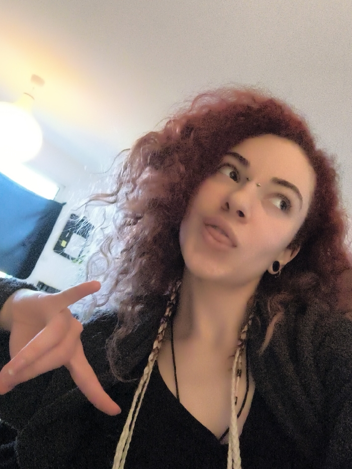 One female subject is depicted in an indoor setting, likely a room, in the city of Unknown, Unknown. The subject has reddish-brown curly hair, fair skin, a bridge piercing above the nose, and black ear gauges in both ears. She is wearing a black top and a dark-colored knitted cardigan. Several thin braids, some light-colored and some dark-colored, are visible draped over her shoulders. The subject's left hand is raised, forming a "V-sign" with the index and middle fingers extended. Her head is slightly tilted, eyes are cast upwards and to the right, and her tongue is partially extended from the mouth. The background features a light-colored ceiling with a visible circular light fixture in the upper left. A light-colored wall is visible on the left, partially covered by a dark blue fabric or curtain. Below the curtain, a framed object with a light rectangular insert and another small light-colored square object are visible on the wall.