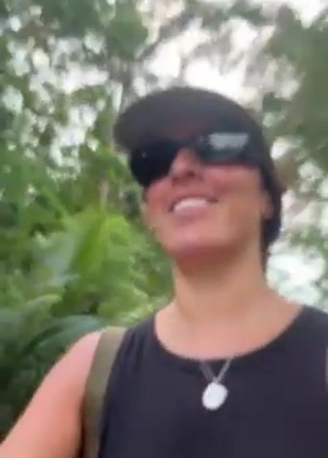 A woman in sunglasses and a baseball cap is taking a video as she rides along a road in a tropical environment