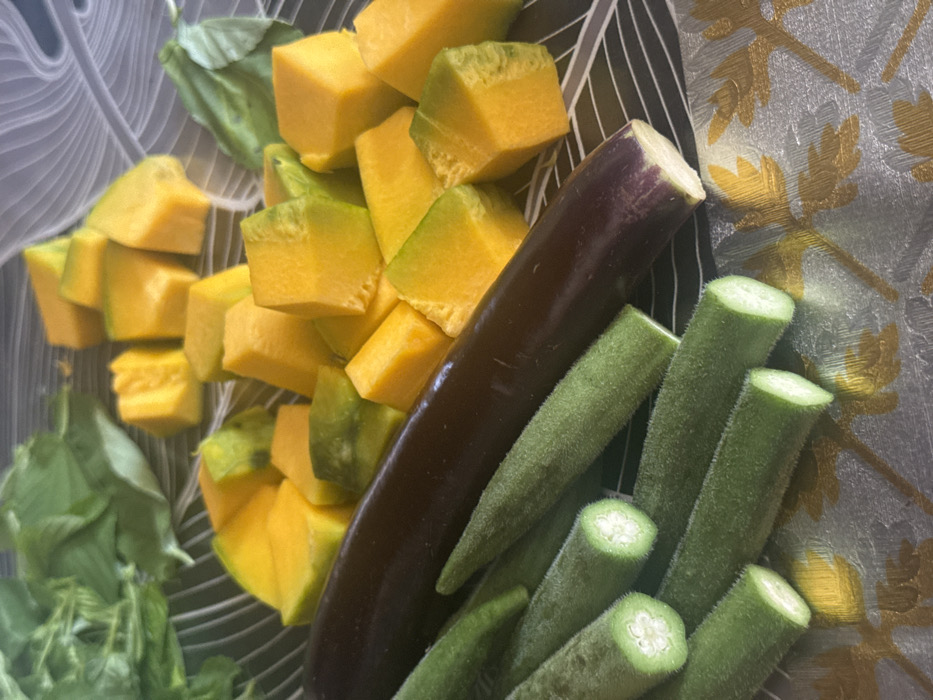 An overhead view displays various raw vegetables arranged on a decorative surface. In the upper right and central areas, numerous irregularly cut cubes of squash are present, exhibiting both bright orange flesh and remnants of green skin. A single, dark purple eggplant, partially trimmed at one end, lies horizontally across the mid-section. To the lower left, a cluster of green okra pods is arranged diagonally; some pods are whole, while others are cut, revealing their white, star-shaped cross-sections. A small pile of fresh green leafy vegetables occupies the upper left quadrant. The underlying surface features a dark background with thin, white, swirling patterns in the upper half, transitioning to a lighter, reflective lower half adorned with golden leaf-shaped motifs. The scene is located in Koronadal, Philippines.