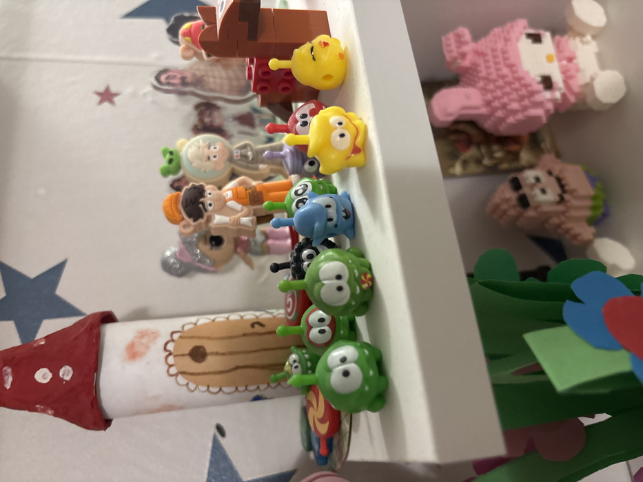 - "The image depicts a collection of toys and decorative items arranged on two white shelves within an indoor setting, consistent with a child's room in Krasny Klyuch, Russia" by FM-oAmG62, licensed under CC BY 4.0